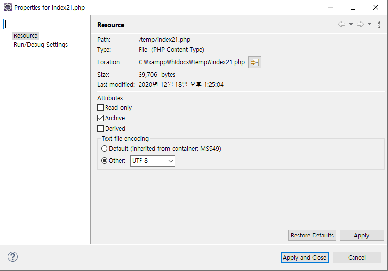 Window - Preference 에서 UTF-8 로 인코딩을 바꿨는데도