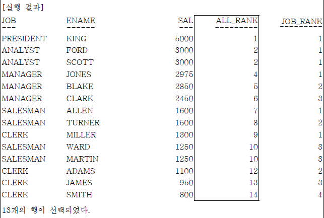SELECT JOB, ENAME, SAL, RANK() OVER(ORDER BY SAL DESC) ALL_RANK, RANK() OVER(PARTITION BY JOB ORDER BY SAL DESC) JOB_RANK FROM EMP;위와 같이 코드를 작성할 수 있다