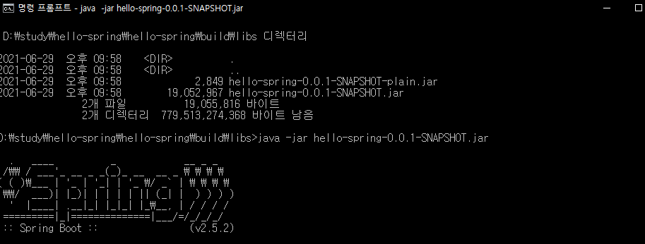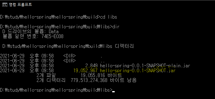 파일 크기가 큰 hello-spring-0.0.1-SNAPSHOT.jar 를 java -jar 명령어로 실행시켜 준다