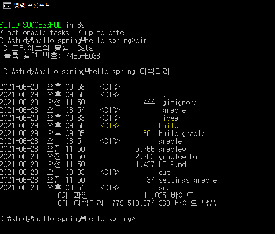 dir 를 입력해 폴더 구조를 보면 build 라는 폴더가 있다
