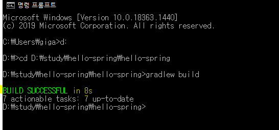gradlew buildgradlew build 명령어를 입력하면 빌드가 시작되고 BUILD SUCCESSFUL 이 뜬다!