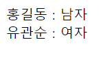 [ {"name":"홍길동","gender":"남자"}, {"name":"유관순","gender":"여자"} ]