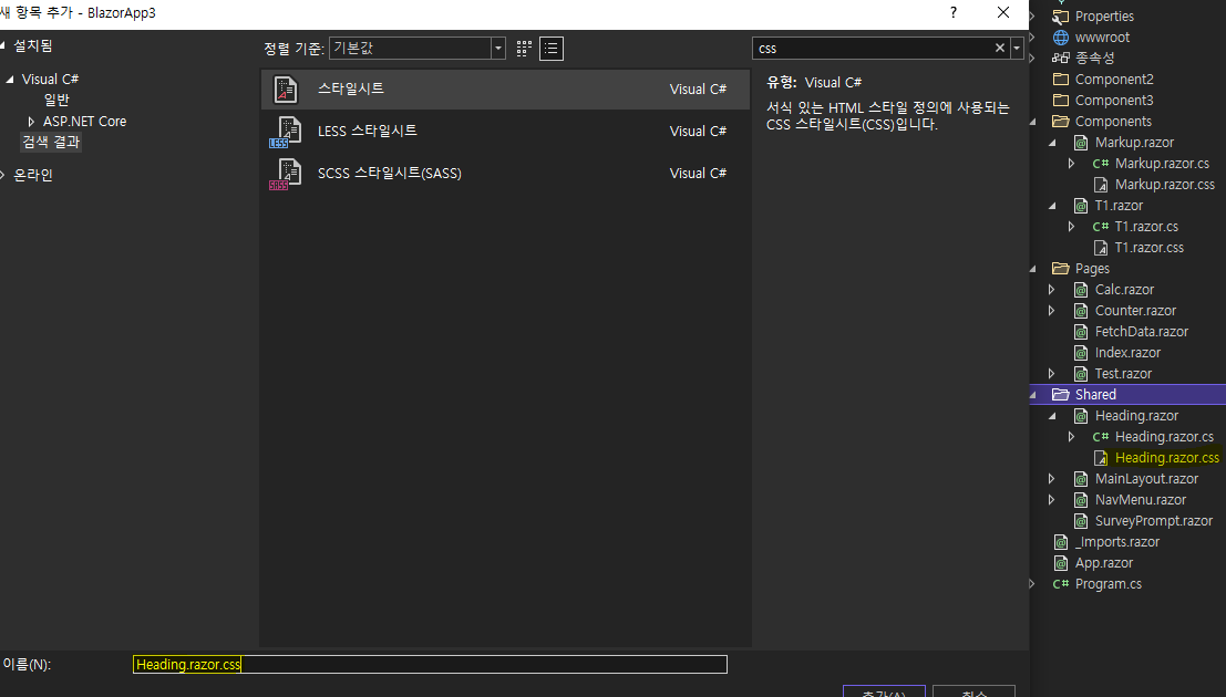마지막으로 디자인 코드를 작성할 Heading.razor.css 을 생성한다