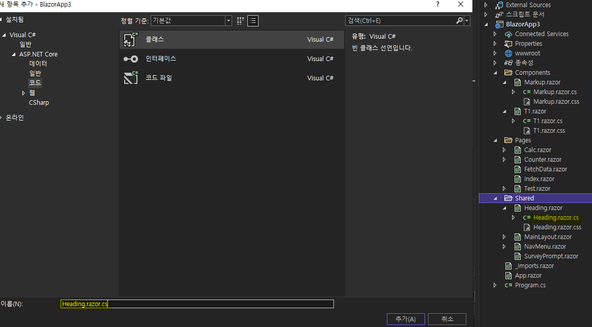 그리고 Heading.razor 파일의 코드를 작성할 클래스 파일을 생성한다