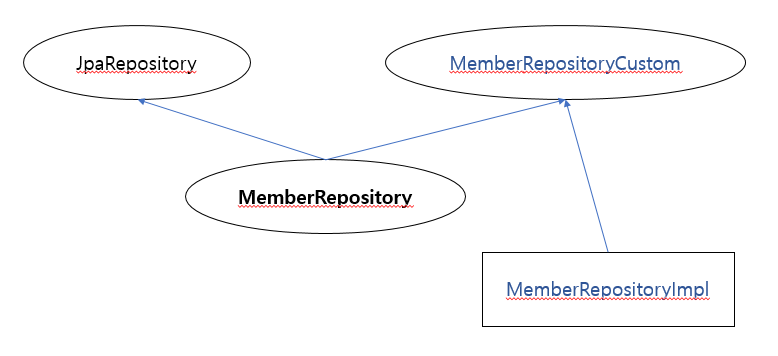 반드시 클래스명은 XXXRepositoryImpl 이어야 Spring data jpa 에서 구현체로 인식할 수 있다.@RequiredArgsConstructor public class MemberRepositoryImpl implements MemberRepositoryCustom { private final EntityManager EntityManager; @Override public List<Member> findUser(String username, int age) { return em.createQuery("select m from Member m where m.username = :username and m.age = :age") .setParameter("username", username) .setParameter("age", age) .getResultList(); } }마지막으로 MemberRepository 인터페이스를 수정하자.