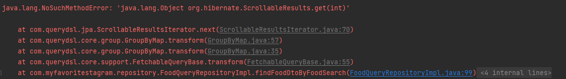 안녕하세요. spring boot 3.1.0 으로 업그레이드하여 hibernate 6.2.2 버전을 사용하고 있습니다.Querydsl 로 개발 도중 간단한 select 문은 정상적으로 작동이 되었는데,transform(groupBy().list()) 함수를 사용하니