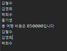 public class CustomerTest { public static void main(String[] args) { // 고객 리스트 생성 ArrayList<Customer> list = new ArrayList<Customer>(); list.add(new Customer("김철수", 25, 250000)); list.add(new Customer("김영희", 50, 250000)); list.add(new Customer("박희수", 33, 250000)); list.add(new Customer("홍기영", 7, 100000)); // 고객 명단(이름) 출력 list.stream().map(c -> c.getName()).forEach(name -> System.out.println(name)); // 총 여행 비용 출력 int total = list.stream().mapToInt(c -> c.getPrice()).sum(); System.out.println("총 여행 비용은 " + total + "입니다"); // 20세 이상 고객 명단(이름) 출력 list.stream().filter(c -> c.getAge() >= 20).forEach(c -> System.out.println(c.getName())); } }< 결과 >